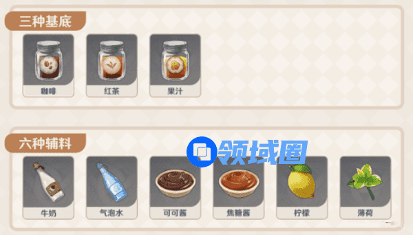 调制饮品的材料分为三种基料和六种辅料,通过不同的组合调制出不同的配方。一杯饮品调制时最多加入5份材料。