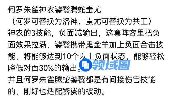 神农也是移除了微不足道的5%免伤,而为这个阵容带来了强大的共工,按之前所说这套阵容能降低30%左右的输出,那么配合上共工,无诅咒状态的灵妖对我方后排造成伤害减少55%,有诅咒状态的灵妖对我方后排造成伤害减少70%以上(此处根据伤害公式将减攻折合成减伤)。毕月乌在这套阵容里将能够发光发热。