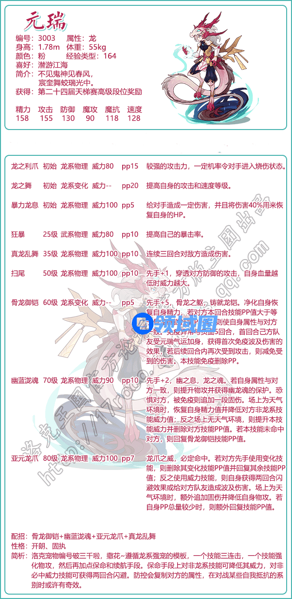 4、简析:洛克宠物编号破三干啦,撒花~遵循龙系强宠的模板,一个技能三连击,一个技能强化物攻,然后再加点保命和续航手段。保命手段上对非龙系技能可降低其威力,对非必中威力技能可获得两回合闪避。防控会复制对方的属性,在对战某些自我抵抗的系别时或许有奇效。