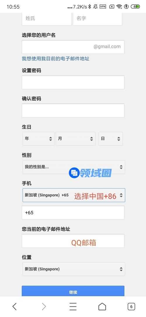 2、填写相关信息,手机号一栏选到中国+86即可,加速器或梯子直接挂到本次的测试地区,下面的地区就会变成当前加速地区。