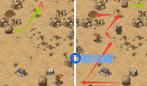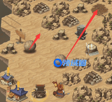 返回上一场景的公孙小屋,重置后滚石重现,地形也有一点点改变,最后将滚石按箭头路线指示推动至四色树处即可,注意控制石柱的有无。(沿下方绕过去便是最佳路线,为了不让左上角显得过于空旷,一并附上走上侧的路线)