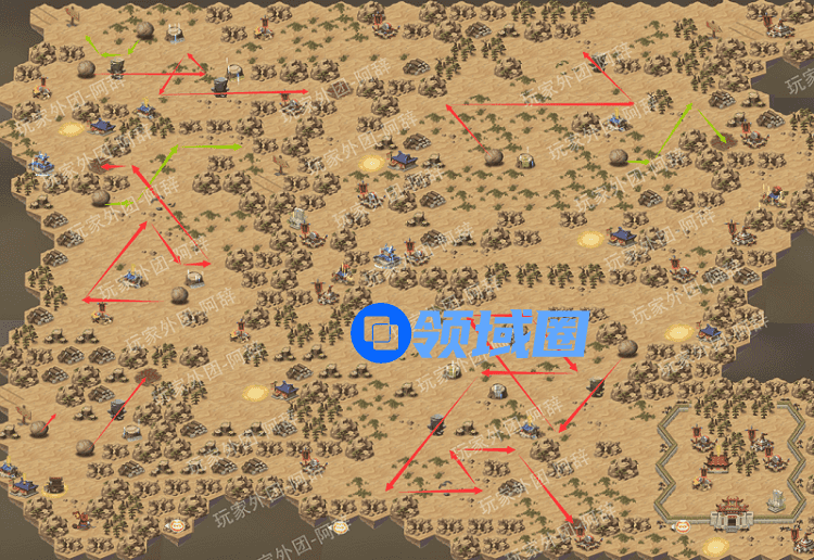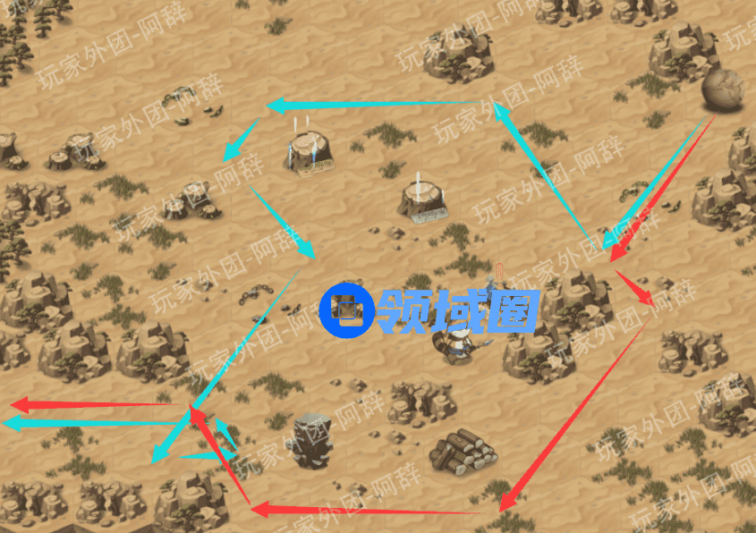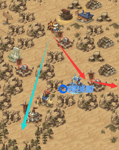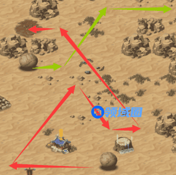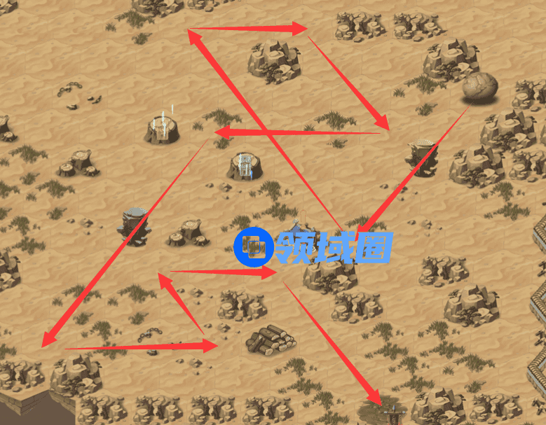返回上一驿站,传送车至新传送点。接下来的两个传送点之间没有滚石机关,注意不要漏掉蓝色区域的箱子即可,之后清理红色箭头区域。