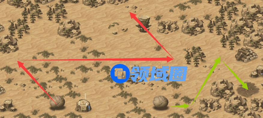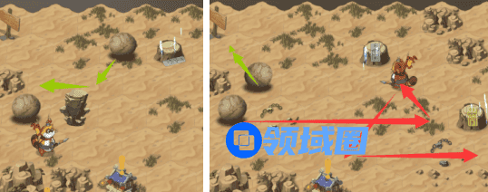 先触发绿色树桩改变石柱位置,将左侧滚石按红色箭头推动三次,然后再次触发树桩复原石柱即可,石柱和滚石正好完美的封住路口,不需要继续往里推动。再按照绿色箭头推动右侧滚石至泥潭。