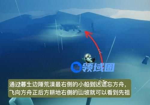 1、通过暮土边陲荒漠最右侧的小船到达遗忘方舟,飞向方舟正后方耕地右侧的山坡就可以看到先祖了。