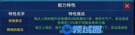 ⑶特性带燃烧的意志的吉拉每次上场能够提升队友魔攻两级(开局先用吉拉,不放技能,换别的亚比,再把吉拉换上来,那就能提升队友四级魔攻,来达到一个快速提属,辅助队友输出的一个作用)