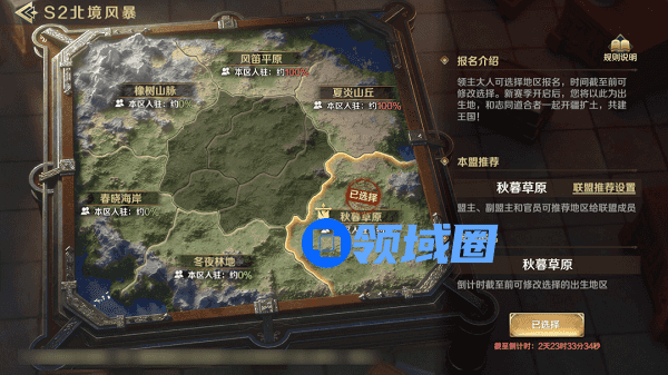 1.一赛季结算后,可进行S2赛季【北境风暴】出生地区选择。一共有6个出生地区可供领主大大选择。