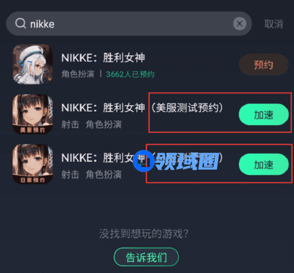 1.第一步:下载【奇游手游加速器】,搜索“NIKKE”或者“胜利女神”,选择想要预约的区服,点击加速