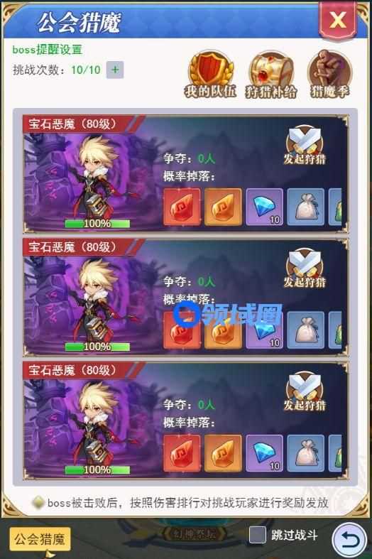 1. 公会猎魔副本BOSS血条是按照百分比计算的,根据挑战一次伤害值比例分配公会成员挑战次序,避免出现伤害量溢出,已达最大化宝石收益获取。
