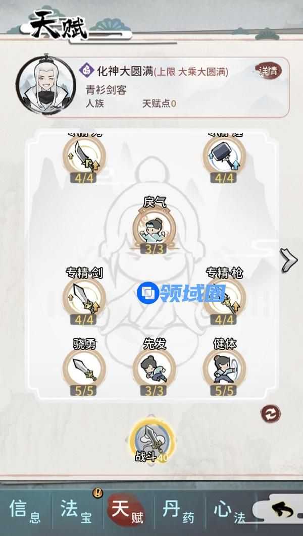 5.化神大圆满境是有40点天赋值可以点,其他直接全部点满就行,韧性点3点,不然不够用。