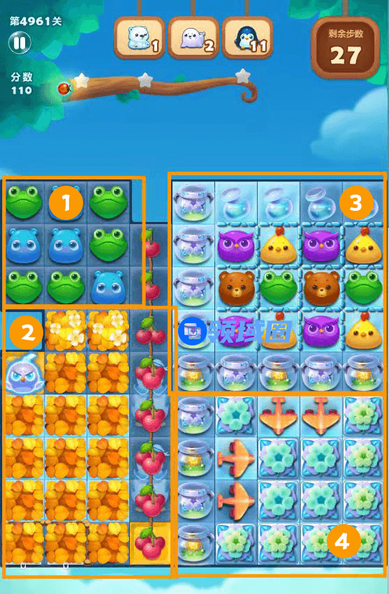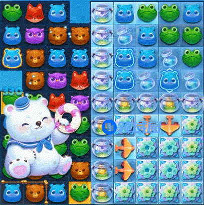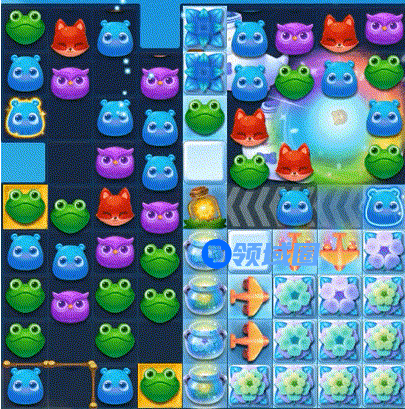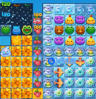 1、本关的难点主要集中在闯关的中后段对冰块的消除上。因为冰层较厚,加上小飞机,阳光瓶能提供的助力效果有限更多还是得依靠直线特效等的合成。