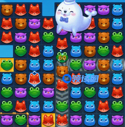 3、第二步:消除蓝色、绿色小动物,点亮并交换左下角染色宝宝。