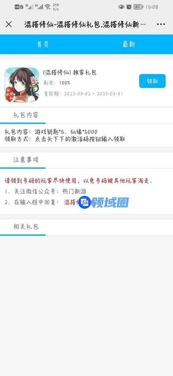 1.关注公众号号“热门新游”回复混搭修仙或1122(一号一次,领完可以取消关注)