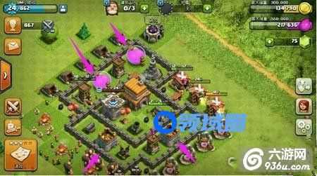 想要破解的话,可以从图中标记地点进攻,那么上方可以打到圣水,下方可以打到金钱,那么看自己的需要了,如果缺圣水的话,就从上方进攻。如果缺钱的话,就从下方进攻哦。