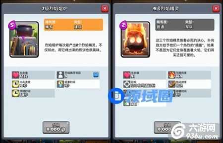 烈焰精灵相当于一个2费打507的AOE法术,可惜的是生命值过少,只能在个别情况下作为解场使用,在对手拥有电击法术的情况下,很容易刚出来就被秒杀。而烈焰熔炉则是烈焰精灵的兵营,基础设定和哥布林兵营近似,唯一的缺点就是持续时间问题,一共只能召唤出10只烈火精灵对于5费而言确实有点亏节奏。