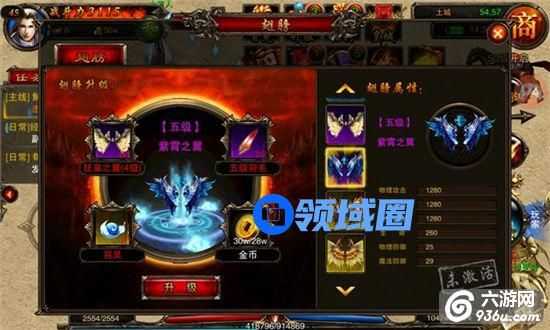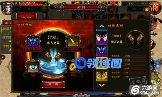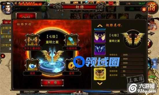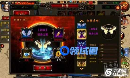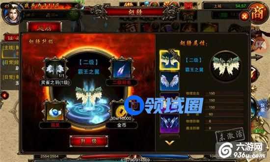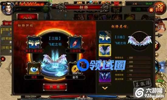界面会显示翅膀的形象,以及翅膀升至下一级所需要的道具,包括前一级的翅膀、羽毛、羽灵和不绑定金币。