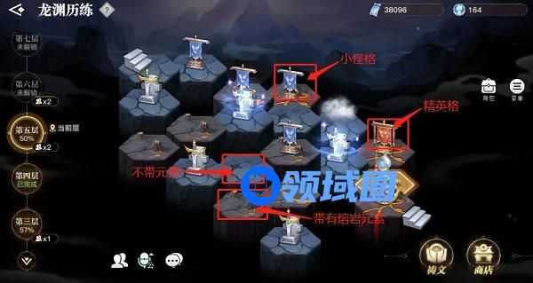 每一层根据闯关时,可以注意每一阶的地板,带有元素的阶进入副本后,场地内会不时落下相应的buff圈,要注意躲避。且每个打怪阶的旗帜不同输出的怪也就分为精英怪与小怪,最后一格为boss怪。