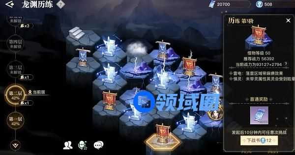 地图一共分为10层,每一层的元素不同,每一层又分为5小阶20个格子,每一阶所刷出的关卡也不同分为历练格、祭剑台与迷雾格。