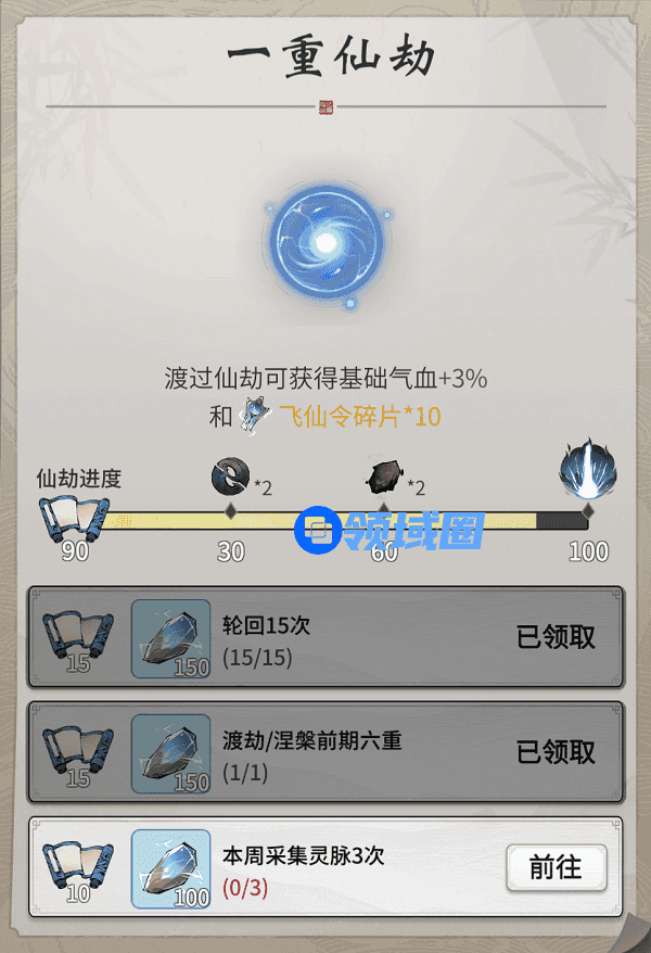 一、每重仙劫有基于仙界裂缝倒计时结束为起点的时间间隔要求,内设有若干养成要求和任务(如采集灵脉、消耗机缘等),考验大家的心性道行。