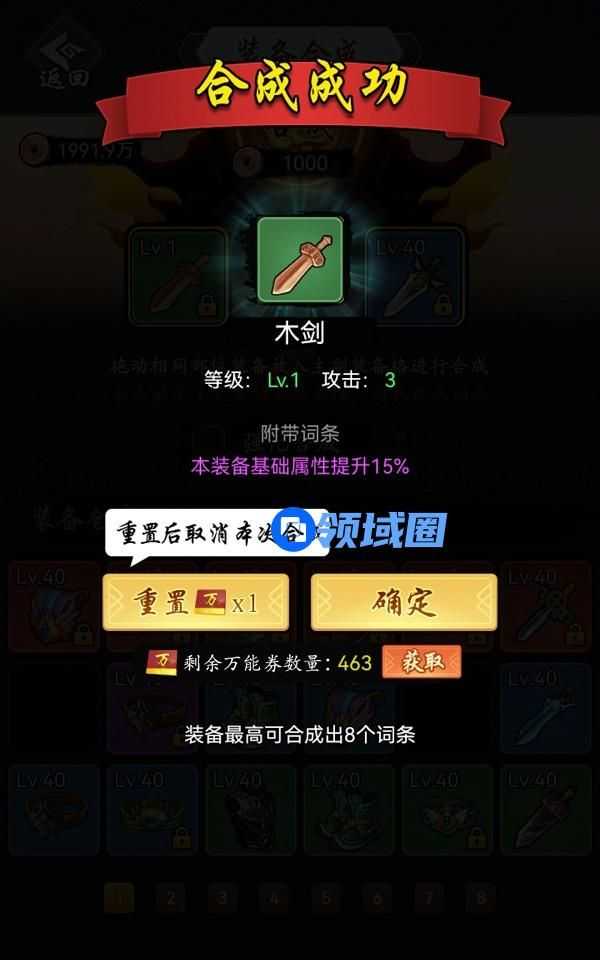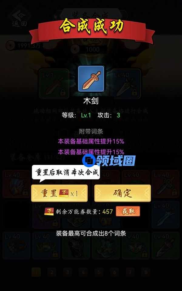 1图是完完全全的废词条,对我们来说没有任何用处,我们选择重置,2图,我们可以看到我们确实获得了15词条,但是,我们也同时获得了其他无用的词条,这部分对我们来说是没有用的,我们选择再次重置,3图,我们完美的拿到了自己想要的属性,我们选择确认,拿到了我们的第一个素材。同时,我们可以看到,武器的基础属性降低到了3,这是因为武器合成的过程中,武器最终的基础属性是和主武器的属性是一致的。