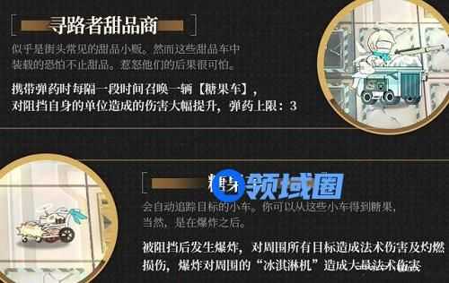 4、之后是冰激凌车这一块,间隔一段时间就能召唤出糖果车,对于阻挡自己的敌人造成大幅度的伤害,而且能有3个弹药可以携带。糖果车完全就是泥头车自爆车,范围法伤+灼烧损伤简直离谱,而且对周围的冰淇淋机会造成大量法伤,简单一句话总结:变种阴间怪冬灵血巫变糖果车。