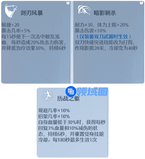 天赋在职业技能页没点到1200技能点时,推荐双刀天赋页的【剑刃风暴】【暗影刺杀】以增强输出能力,通用天赋页【厉战之躯】提升生存能力。