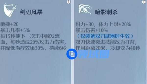 天赋在职业技能页没点到1200技能点时,推荐双刀天赋页的【剑刃风暴】【暗影刺杀】以增强输出能力,通用天赋页【风之忍者】以追求伤害最大化。