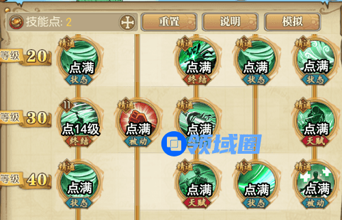 4、20~40级这边,终结技【狮子歌歌】点满,另一个终结技只能分到14级,反正就这么几个没点满的技能,等级你自己根据自己偏向局部调整。其他的天赋、状态、被动点满。