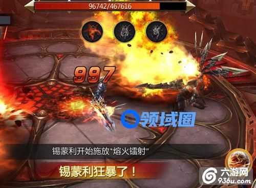 到了战斗中期,每隔一定时间,锡蒙利会走到中间,放一次喷岩,中招会被减速。