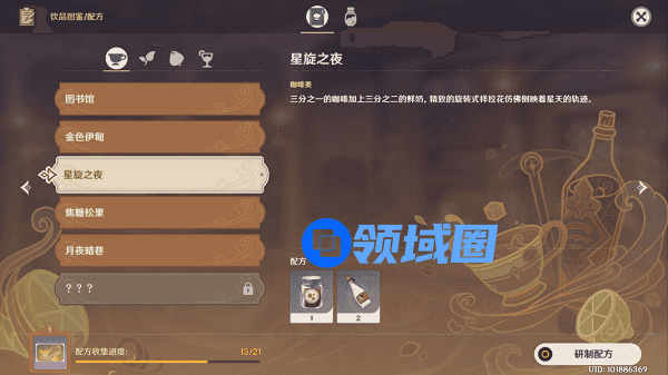 3、其他咖啡类配方:图书馆:咖啡×3、金色伊旬:咖啡×2、牛奶×1、焦糖松果:咖啡×1、牛奶×1、焦糖酱×1、月夜暗巷:咖啡×1、牛奶×1、可可酱×1、远礁浮沫:咖啡×2、气泡水×1