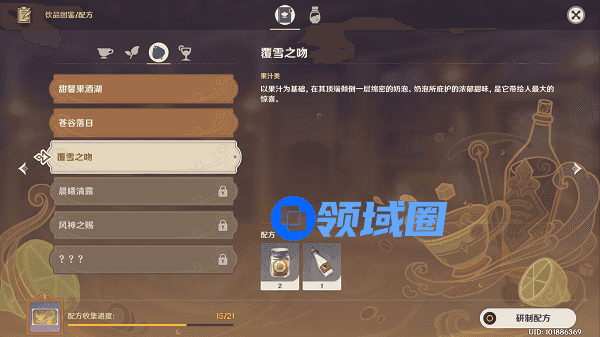 原神覆雪之吻是曲生酌微梦果汁饮品之一,玩家需要根据配方研制,那么原神覆雪之吻配方是什么?原神覆雪之吻配方怎么研制?下面和游戏宝小编一起去了解一下吧。