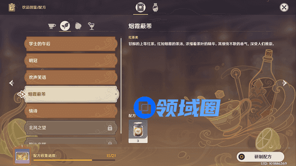 原神烟霞蔽芾是曲生酌微梦红茶类饮品之一,玩家根据配方进行研制,那么原神烟霞蔽芾配方是什么?原神烟霞蔽芾配方怎么研制?下面和游戏宝小编一起去了解一下吧。