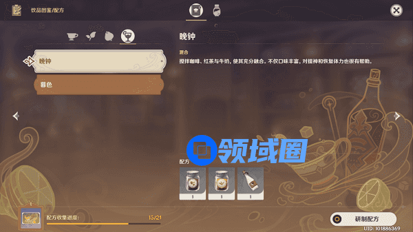 1、晚钟配方:咖啡×1、红茶×1、牛奶×1。暮色配方:红茶×1、果汁×2。