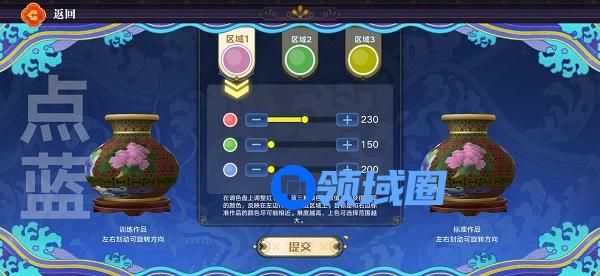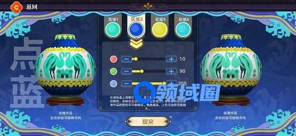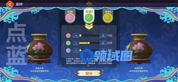 1、要按照右边的成品来调左边样品的颜色,要让左边的与右边的颜色相近,前三个等级有四个区域要调色。最后一个有四个区域需要调色,每个区域要利用红、绿、蓝三种颜色进行调色。