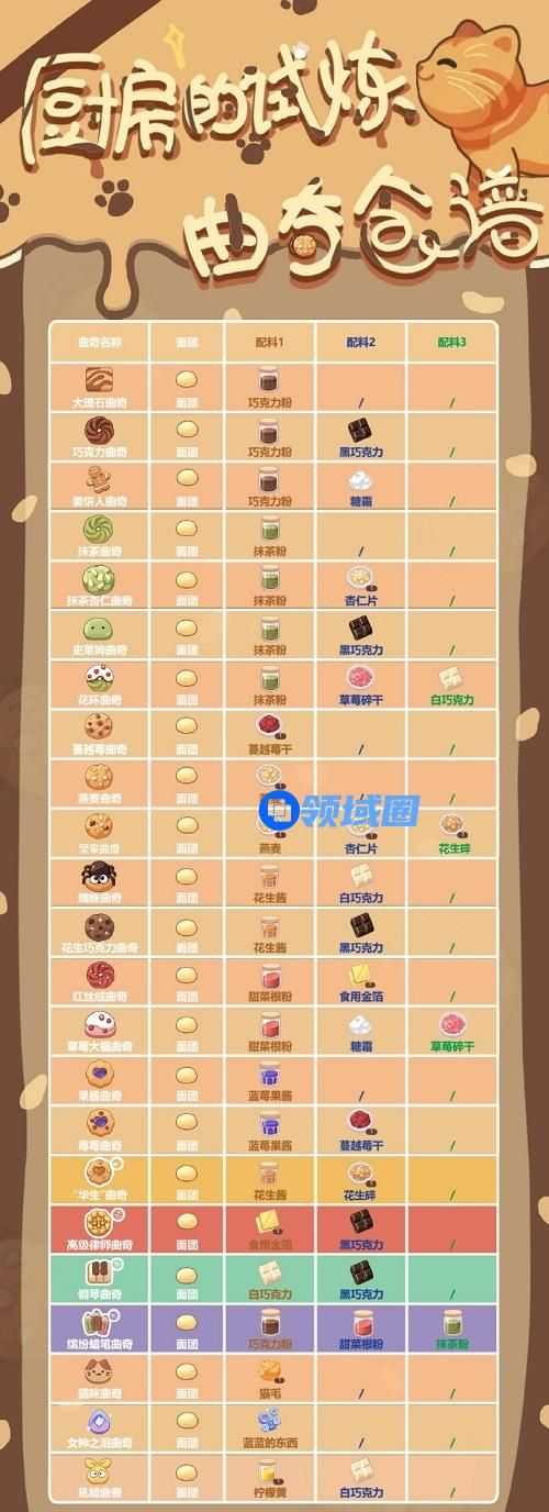 1、厨房的试炼中,每个材料搭配不同的食材都可以组合成不同的曲奇,不知道怎么组的参考上面的组成方式就可以合成对应的曲奇啦。