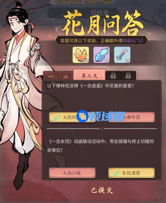 2、《一念永恒》动画联动活动中,常在城镇与修士切磋的是哪位?答案:B.杜凌菲