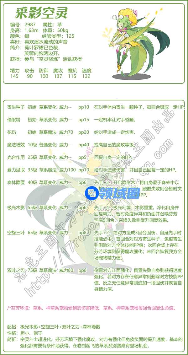 4、简析:空灵斗士超进化。芬芳环境下强化魔攻,对方有强化但免疫负面时提升速度,基本的强化都需要有条件地获得,在卷到起飞的草系系别赛难有登场机会。