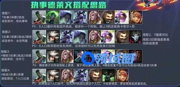 在阵容上有两种搭配,一个是有执事转开7执事,二是没执事转开4精密。在7人口抽卡阶段4挑战强度是高于5执事的,最佳用辛德拉开执事羁绊,可以控一手突进对手。之后再慢慢替换成相应阵容。
