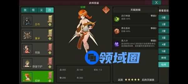 天赋技能是攻击后给我方两名血量最少的武将加血。飞仙后增加自己的伤害和血量。说实话并不推荐他成神和飞仙。前期过度用的。