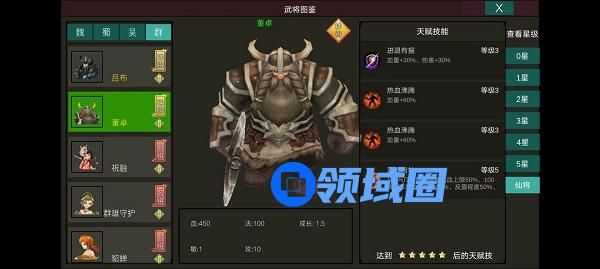 天赋技能进入战斗状态时获得血量上限、反震率、反震程度的增加,概率为友方承受所有伤害直至董卓死亡。飞仙后增加血量和几率。