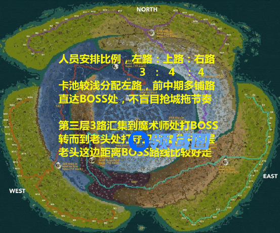 主力走右路和上路,卡池相对较弱的人员选择左路,分配若干大佬协助左路突破某些拦路城池。切记,左路人数不能过少,否则铺路速度过慢会影响打1王&2王进程。