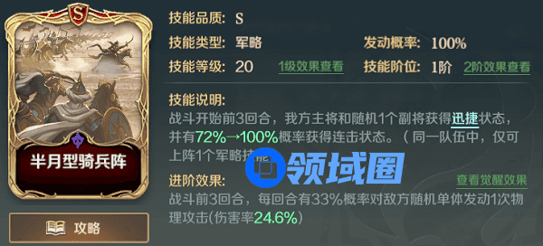 作为突击队核心军略,极为推荐理查佩戴半月型骑兵阵。其技能额外提供的迅捷状态可以让我方主将提前出手,而提供的高概率的连击状态也可以提高我方主将突击技能释放频率,制造大量输出,是突击阵容不可或缺的一环。