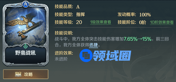 指挥型A级技能,有着不逊于S级的强度,比起半月型骑兵阵,野蛮战吼可提供更全面的迅捷状态,并且还能提高我方突击技能伤害,配上突击队有着不俗的表现。而且A级技能升阶相对容易,进阶以后还能提供单体的物理伤害,非常适合理查一世佩戴。