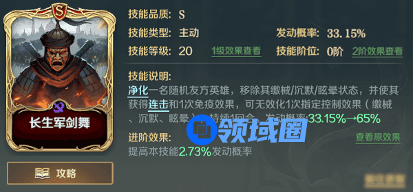 主动型技能,和突击队配合也是相得益彰,触发之后会净化一名随机友军,移除其受控状态,并获得连击状态和一次免控效果(缴械、沉默、眩晕);对于需要依靠爆发同时害怕控制的突击队来说,属于雪中送炭,但有一点需要注意,因为是主动技能,敏捷会影响出手速度,如果理查一世佩戴的话,需要提升敏捷属性优于我方其他英雄出手,方可做到收益最大化。