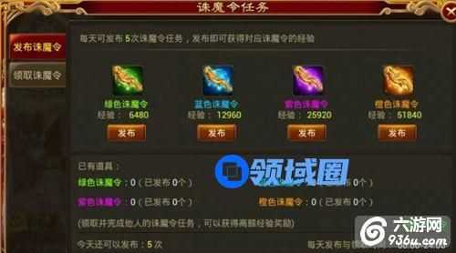 首先发布诛魔令(可以发布5次,发布的诛魔令可领取相对应的经验奖励,橙色最高)