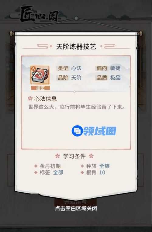 3.选择完毕将自动生成与该弟子技艺属性值相匹配的天阶技艺心法。(如:选择技艺属性值为炼器14的弟子,则自动生成天阶炼器技艺心法)