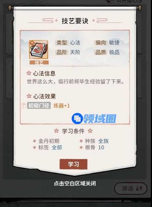 7.任意境界、根骨(根骨1及以上100%学习成功)的弟子都可以进入修炼房学习该心法。