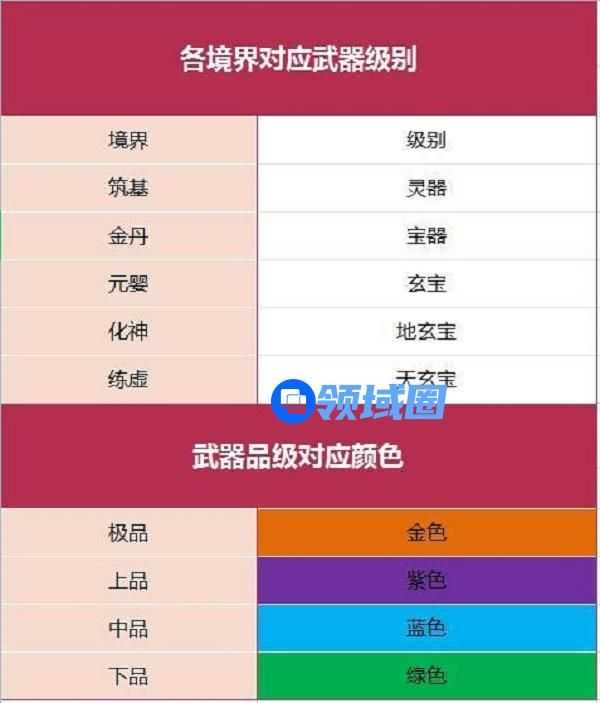 当然,武器也分品级,与等级境界,以下附上一目了然表,看了你就秒懂。