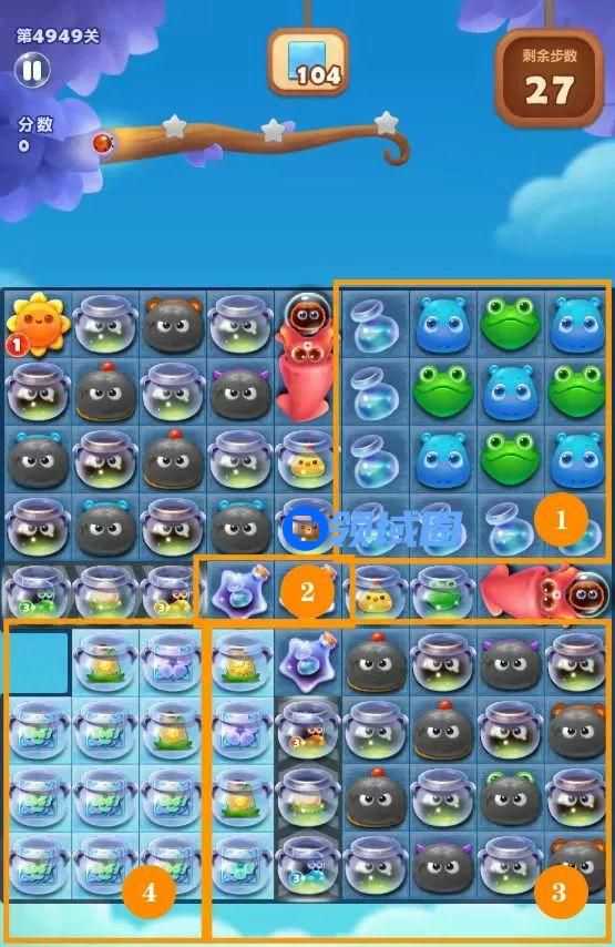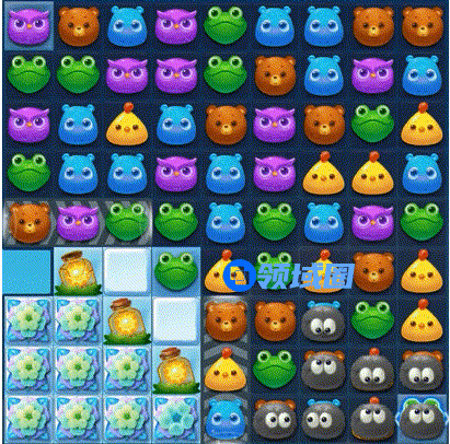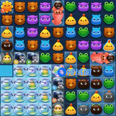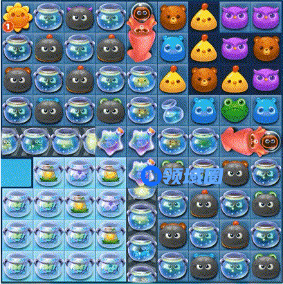 星星瓶交换实现一次清屏特效,然后消除棕毛球赶走墨鱼仔