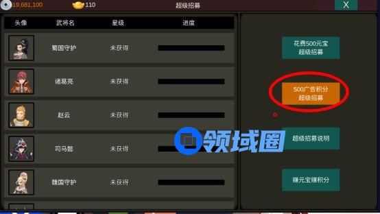 1. 前期一定要通过看AD广告得积分,通过超级招募500积分得招募池的所有3星武将之一。