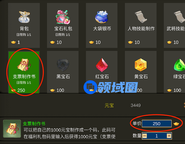 购买支票制作书首先要在商店里花250元宝购买一个支票制作书